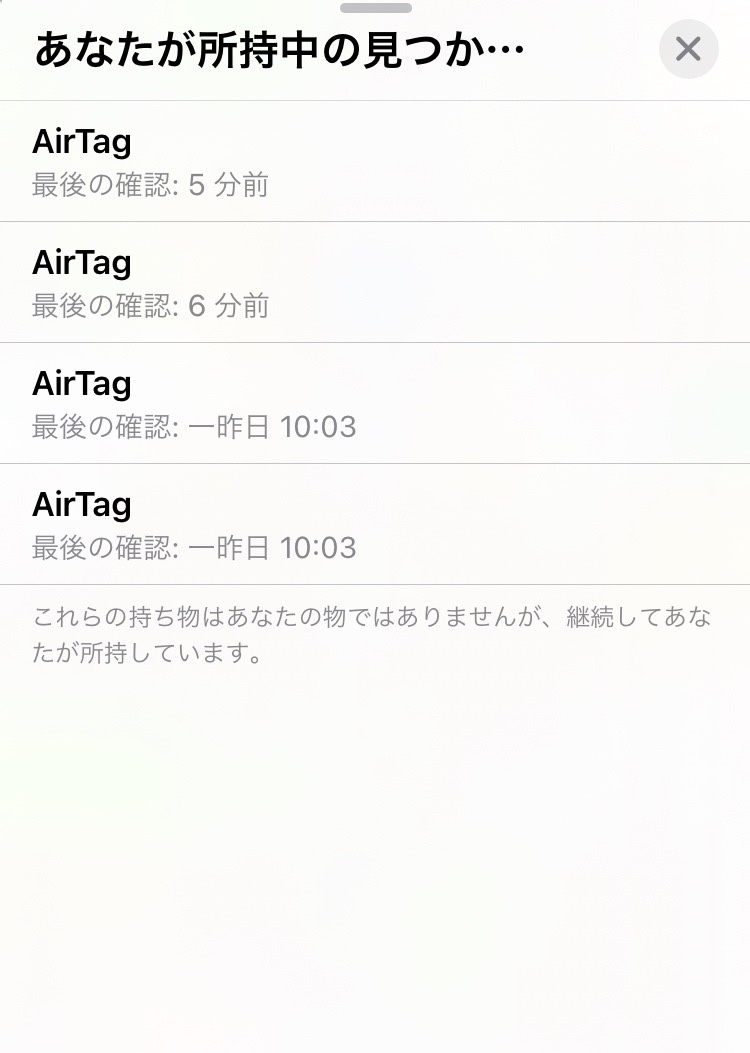AirTagを使用しています。購入時は全くそのような事がなかったのですが、最近自分のAirTagにも関わらず、他人のAirTagのような通知が来てしまいます。