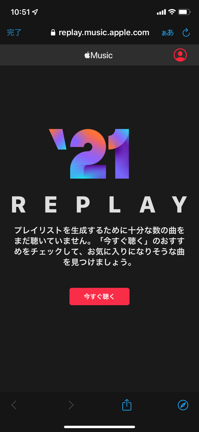 Apple Music Replay 2021を確認したいのですが、サイトからログインして見ても、「プレイリストを生成するために十分な数の曲をまだ聞いていません。」と出てきます。毎日ミュージックアプリで音楽を聴いているのになぜ反映されていないのでしょうか。