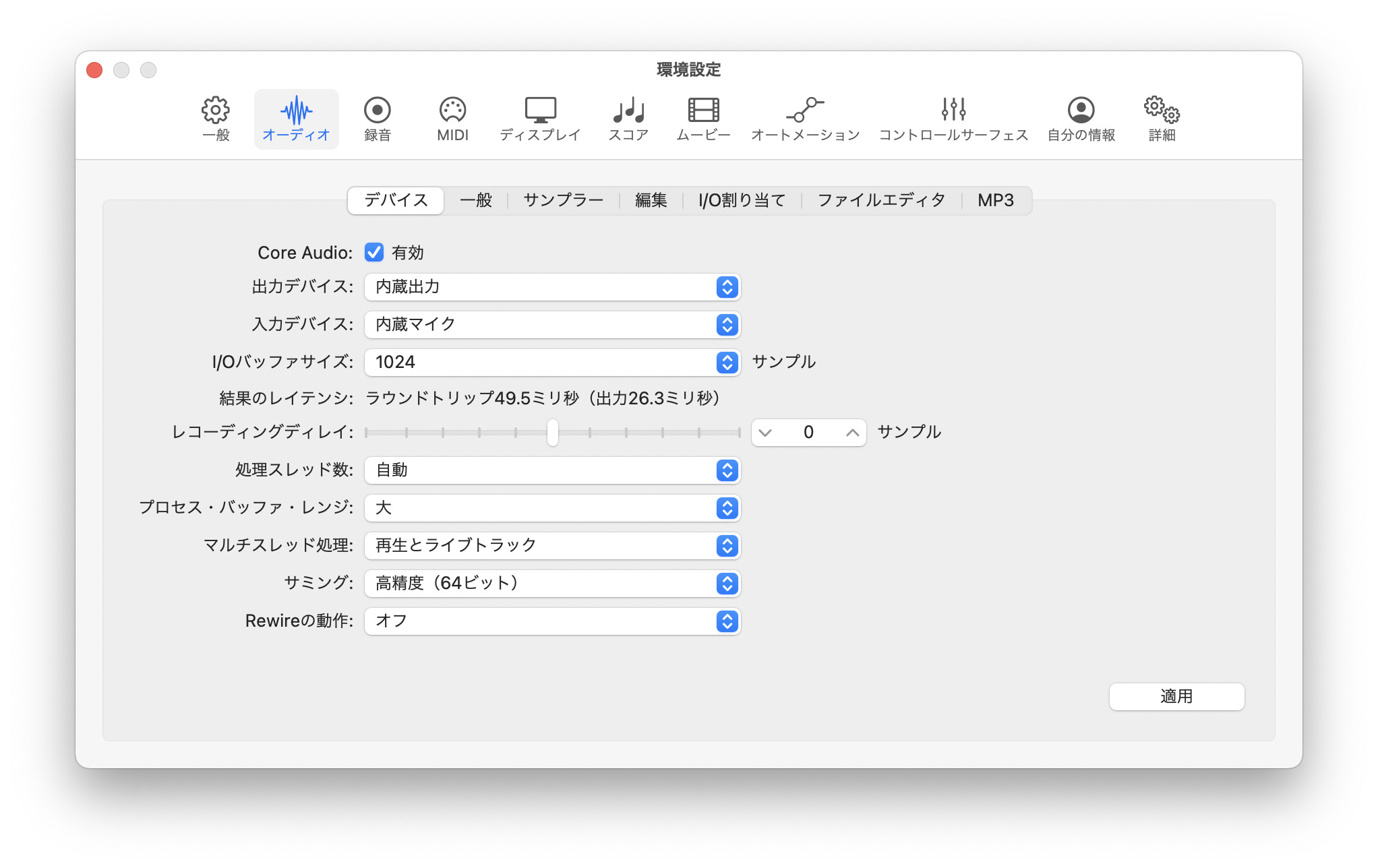 Logicの環境設定で入力ソース(デバイス)は「内臓マイク」になっていますか?