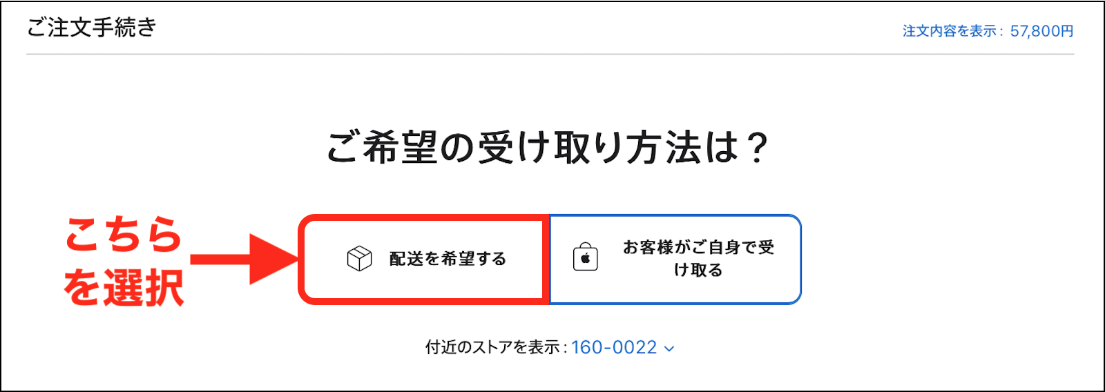 もしかして、「ご注文手続き」の「ご希望の受け取り方法は?」の画面で、「お客様がご自身で受け取る」を選択されていませんでしょうか?