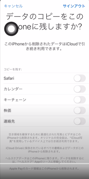 • 写真やデータをiPhoneに残すか聞いてくるので、残すを選択