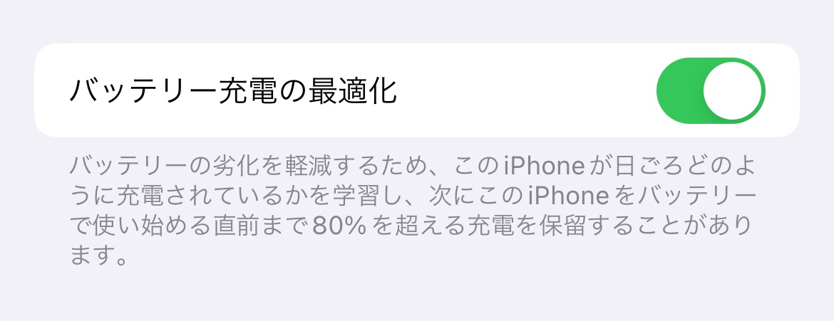 - 「設定」>「バッテリー」>「バッテリーの状態」>「バッテリー充電の最適化」