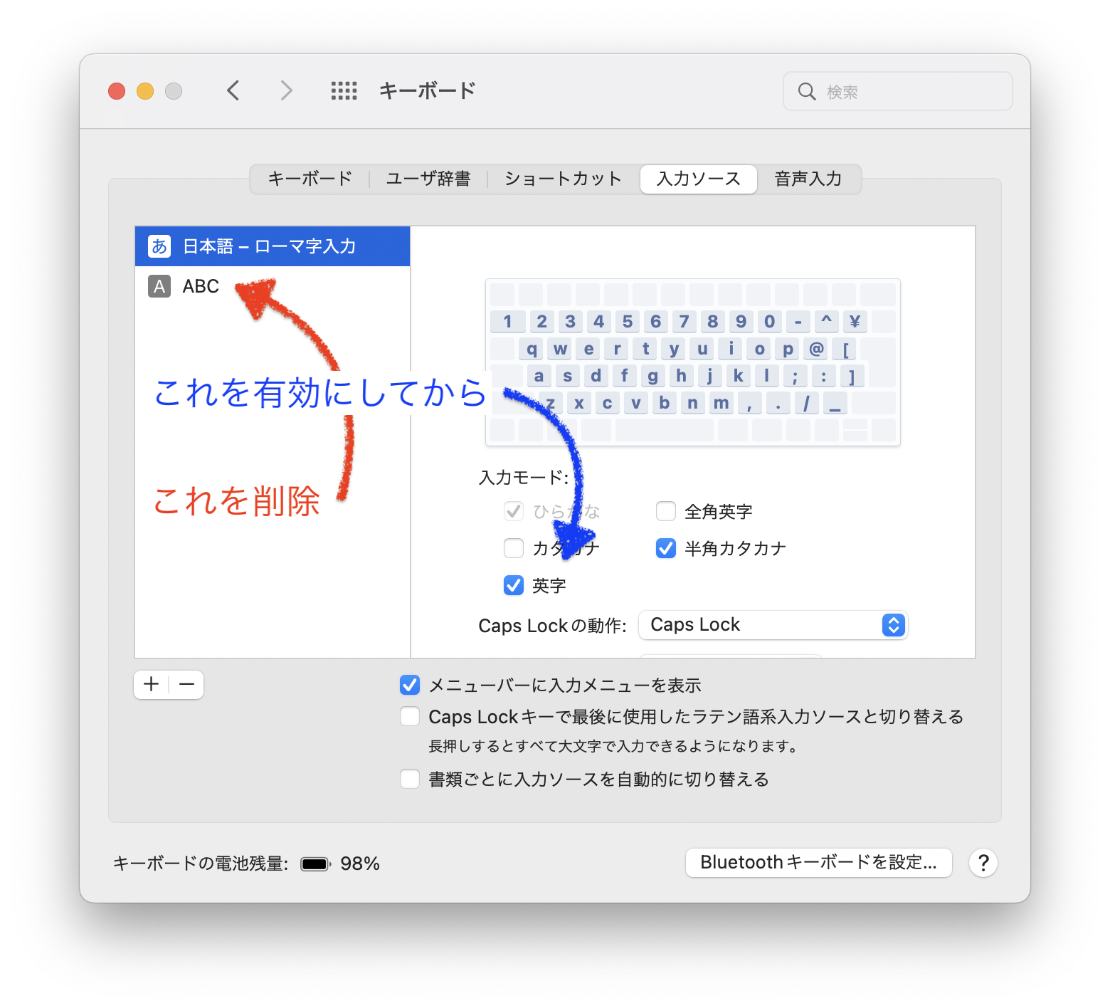 ちなみに、キーボードの入力ソースは、ローマ字入力の一つだけで、入力モードはひらがな、英字の二つにチェックを入れています。