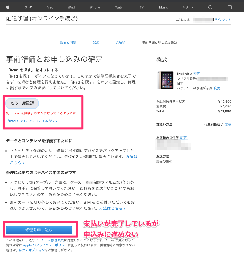 バッテリー交換の修理依頼→クレジットカード(デビットカード)で支払い→支払いが完了し修理依頼ができない