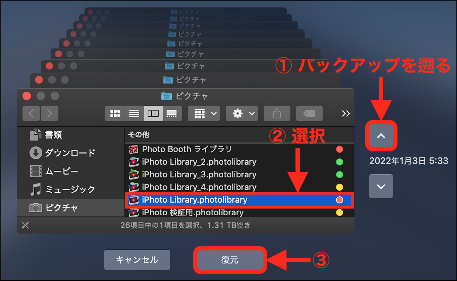 「ライブラリを選択」パネルに「iPhoto Library.photolibrary」が表示されない場合は、「Finder」を開いて「ピクチャ」フォルダ内に、「iPhoto Library.photolibrary」が有るか確認 して見て下さい。
