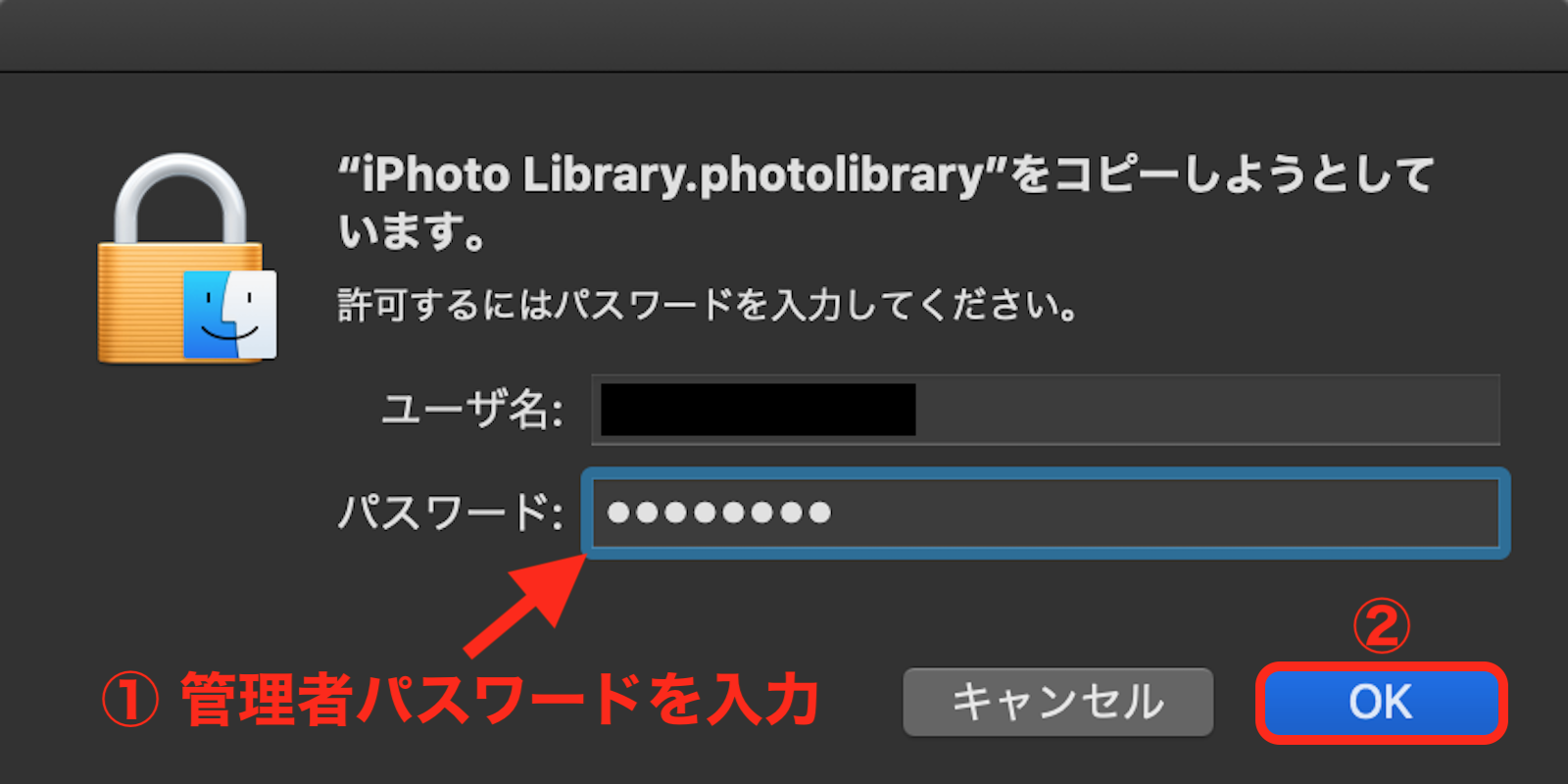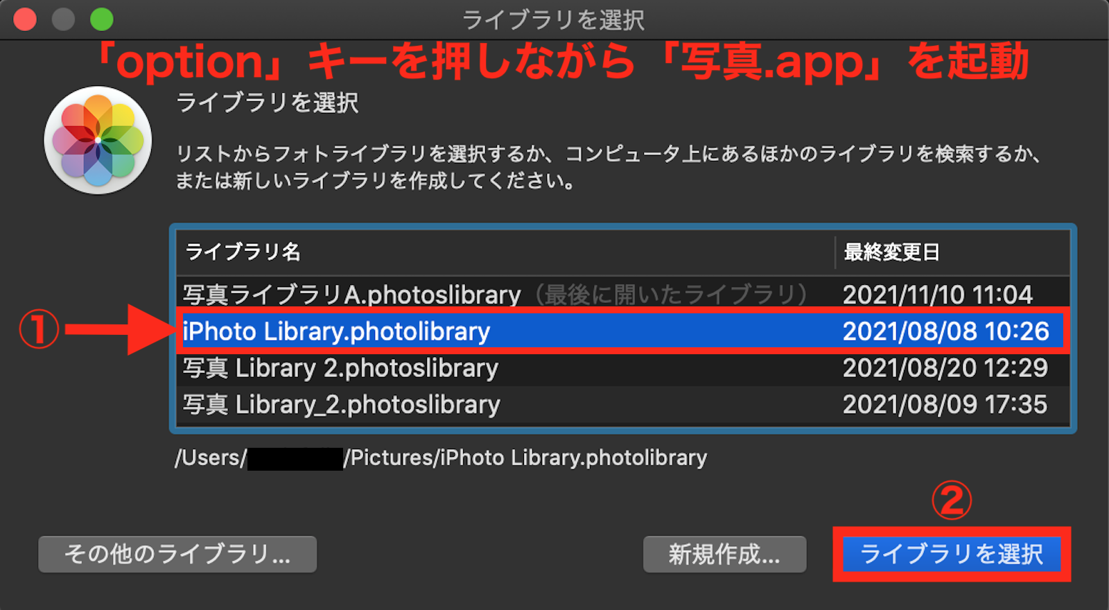 ライブラリー選択にて検索をかけても、「iphoto library」が出てきません。