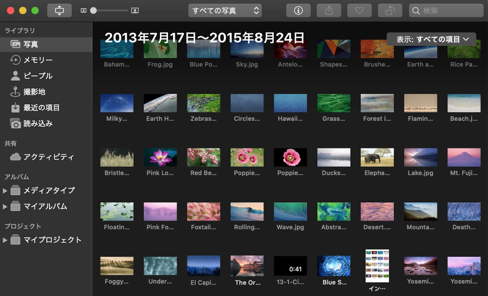ライブラリのアップデートが完了すると、下の画像の様に「iPhoto Library.photolibrary」に有った写真や動画が表示されます。