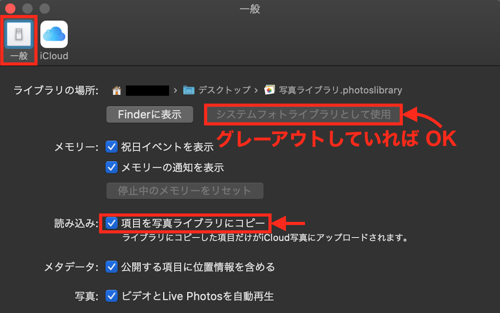 次に、「写真」メニュー >「環境設定」>「一般」タブで、「システムフォトライブラリとして使用」ボタンをクリックして、「システムフォトライブラリとして使用」ボタンがグレーアウトしている事と、「項目を写真ライブラリにコピー」の項目にチェックが入っている事を確認して下さい。