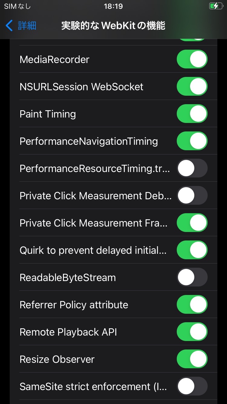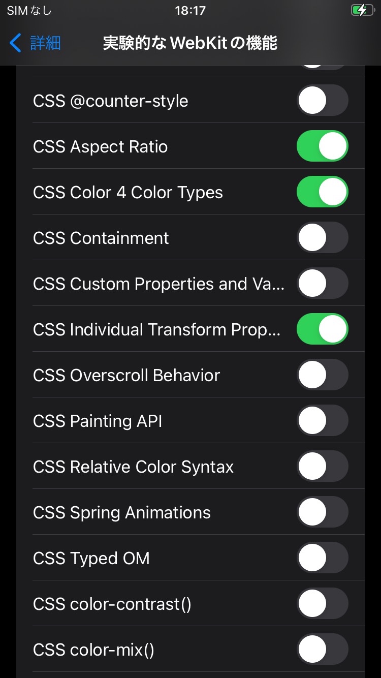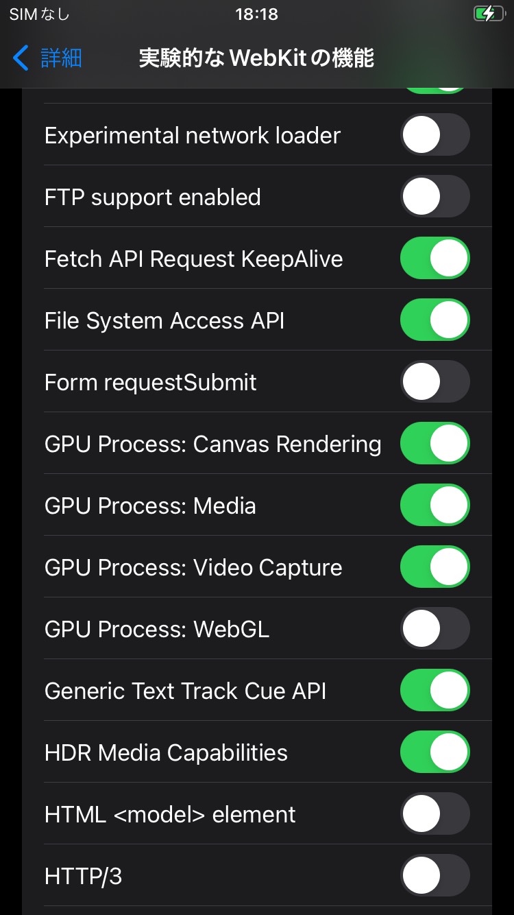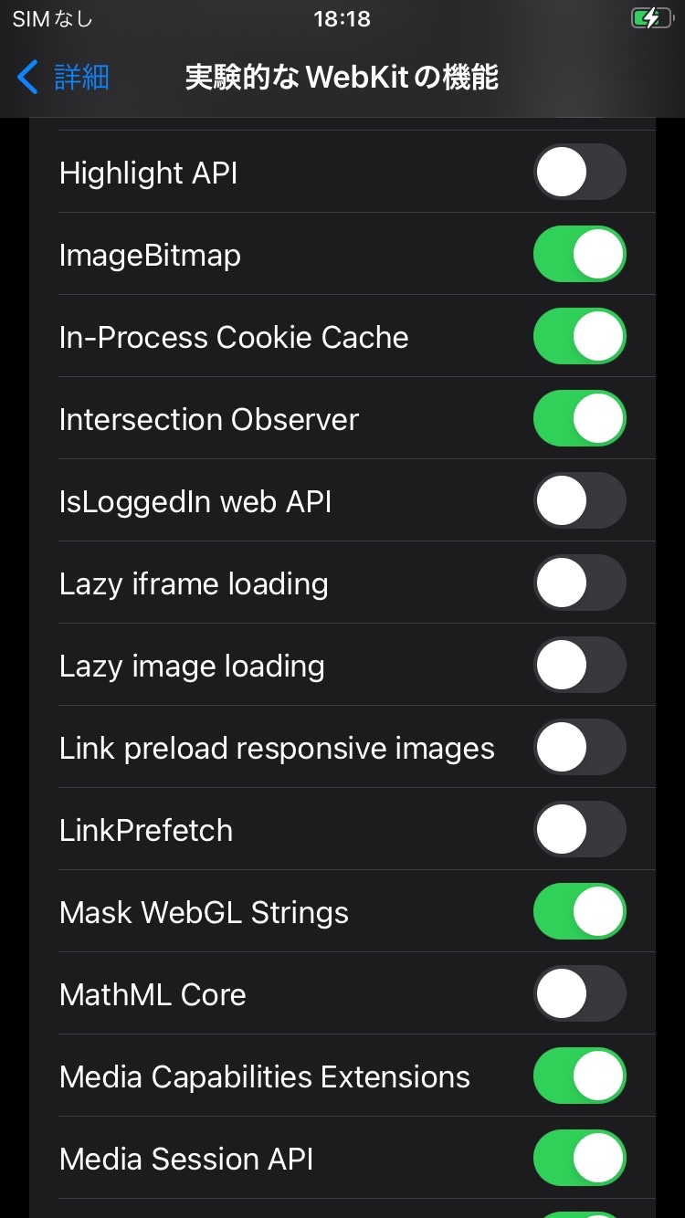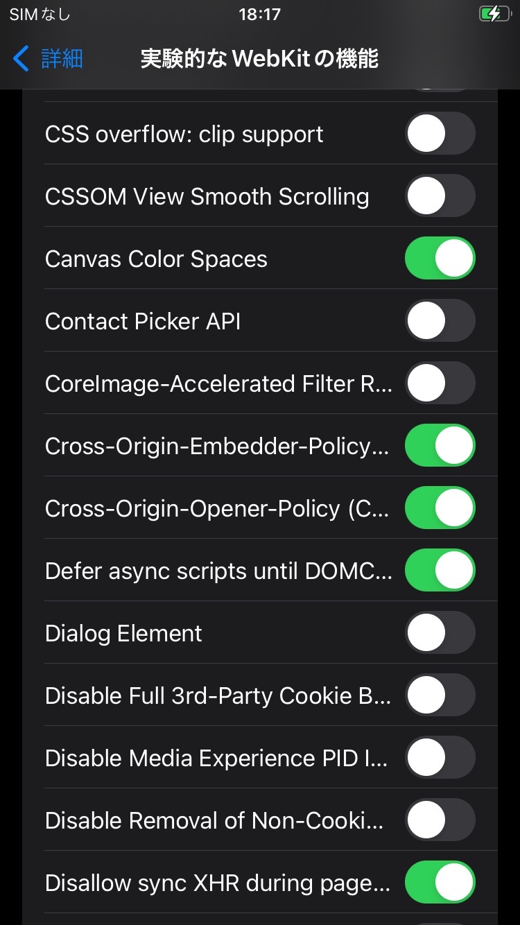 Default settings for iOS15.2 Safari Experimental WebKit Features “ 実験的WebKitの機能”の初期値