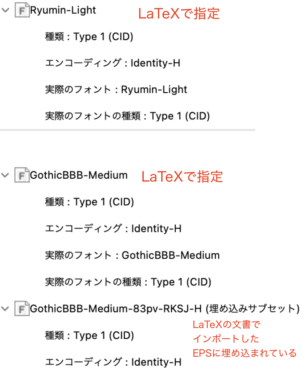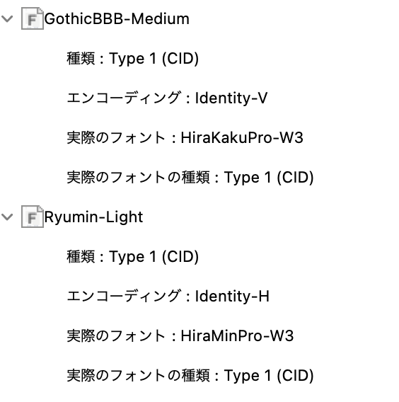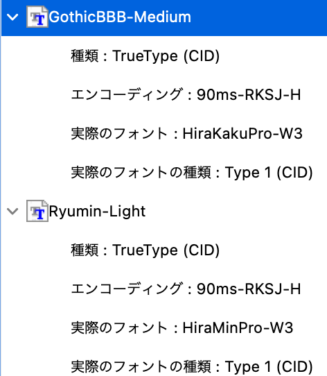 いずれも埋め込みはされておらず、AcrobatではHiraKakuProとHiraMinProが実際のフォントとして使用されています。