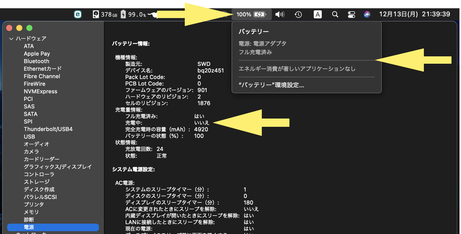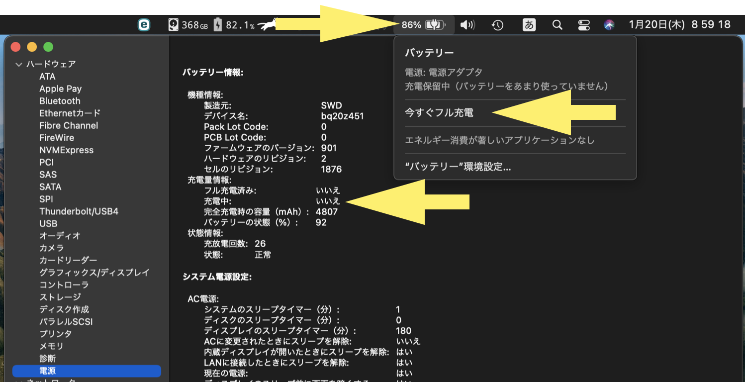 これまでメニューバーのバッテリーをクリックすると「今すぐフル充電」を選択することができていたのですが、