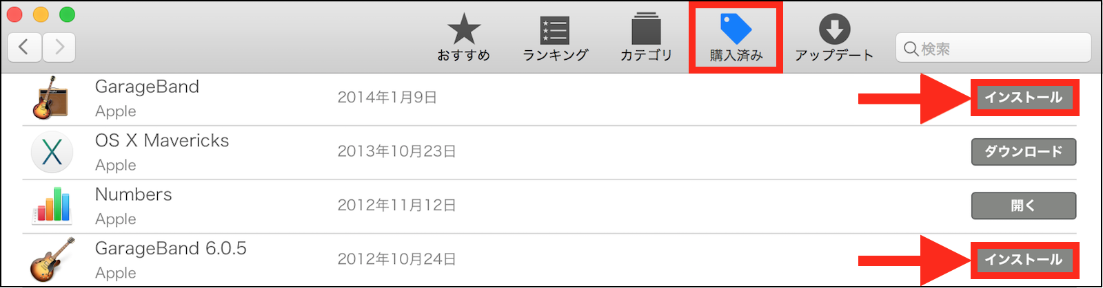 「GarageBand」も「Pages」と同様に、今までに一度でも「GarageBand」をダウンロードした事が有れば、上記の手順で再インストール 出来ます。