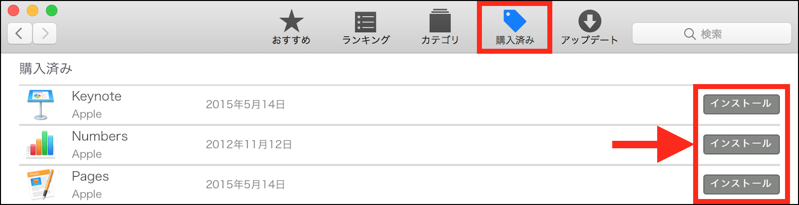 やすどんさんがお書きの様に、一度でも「Pages」をダウンロードした事が有れば、上記の手順で再インストール出来ますが、今までに一度も「Pages」をダウンロードした事が無い場合は、この方法は使えません。
