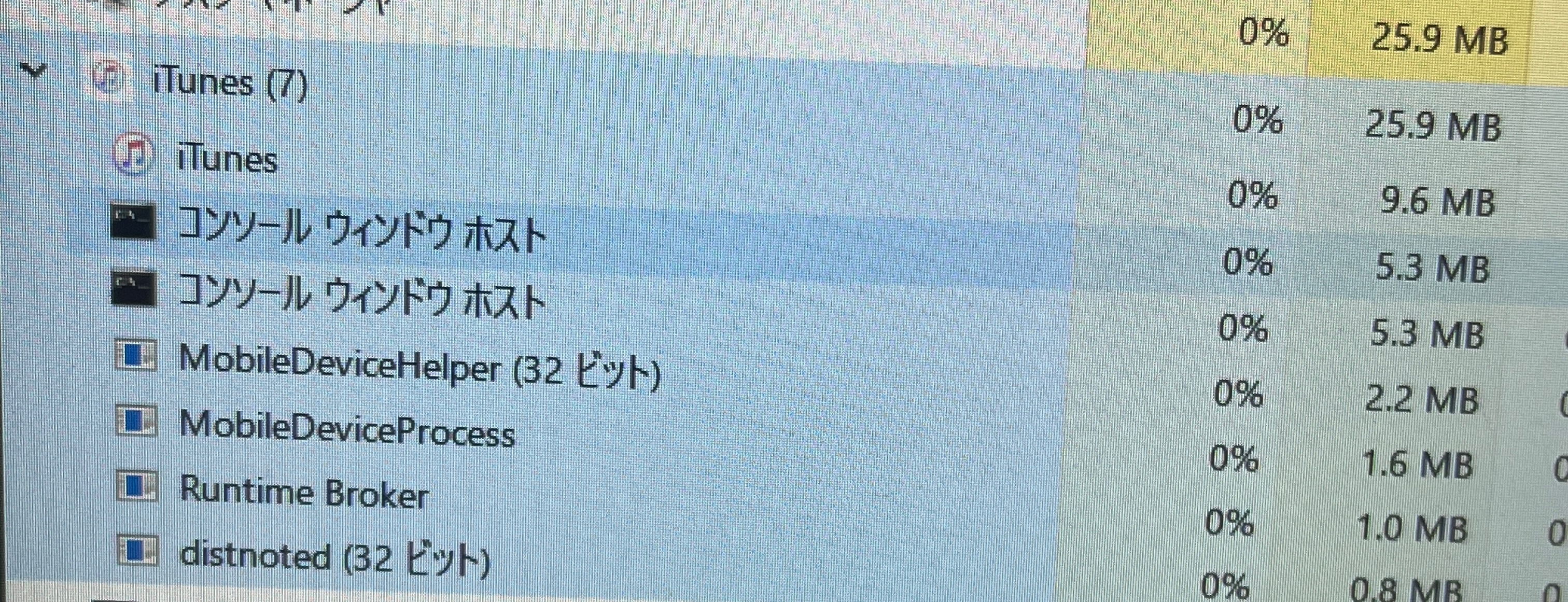 iTunesを選択すると、タスクマネージャーではこの様に7〜9個のタスク?が立ち上がっているのは確認出来ます。