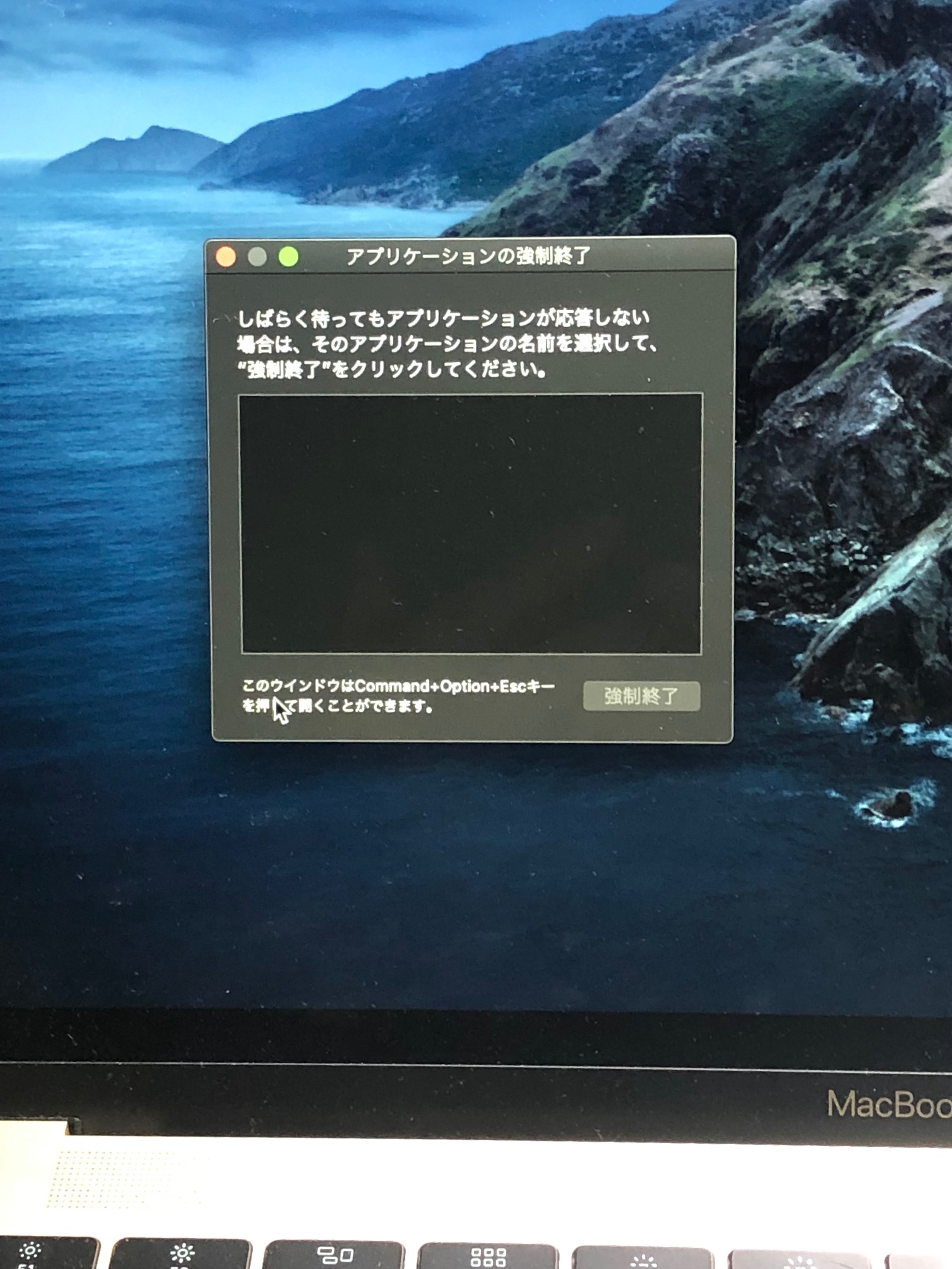 あるアプリのソフトウェアがフリーズしてしまったので、Mac を再起動させようとしたらMacBookそのものが以下の状態でフリーズしてしまいました。