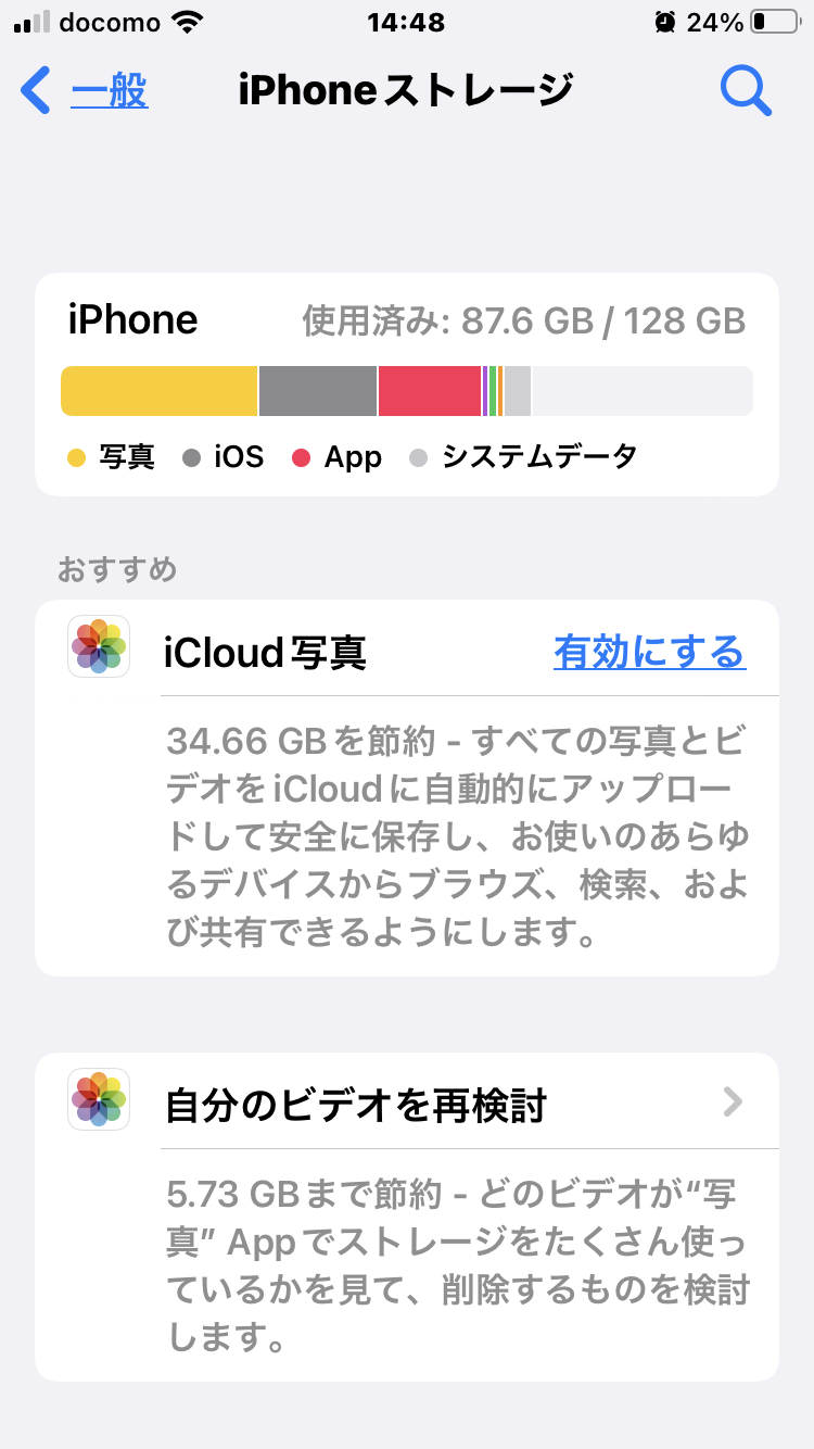 「iPhoneのストレージがいっぱいです」とメッセージが出ます。