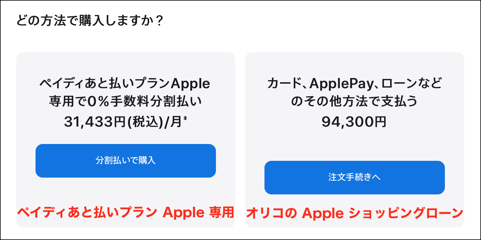 その場合、Apple Store での「分割払い」には、「ペイディあと払いプラン Apple 専用について」と「オリコの Apple ショッピングローン」の2種類が有りますが、どちらをご希望でしょうか?
