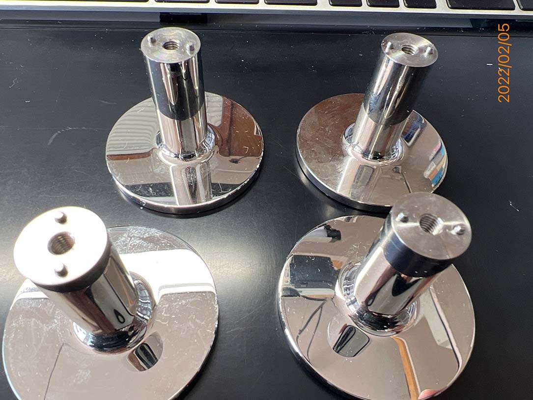 写真のようにスタンドには固定用のピン2本が1.5mmほど付いておりネジを緩めていってもこのピンが外れないとスタンドは回して外す事が出来ません。(4本のネジはクロムのフレーム内に残ったままです)