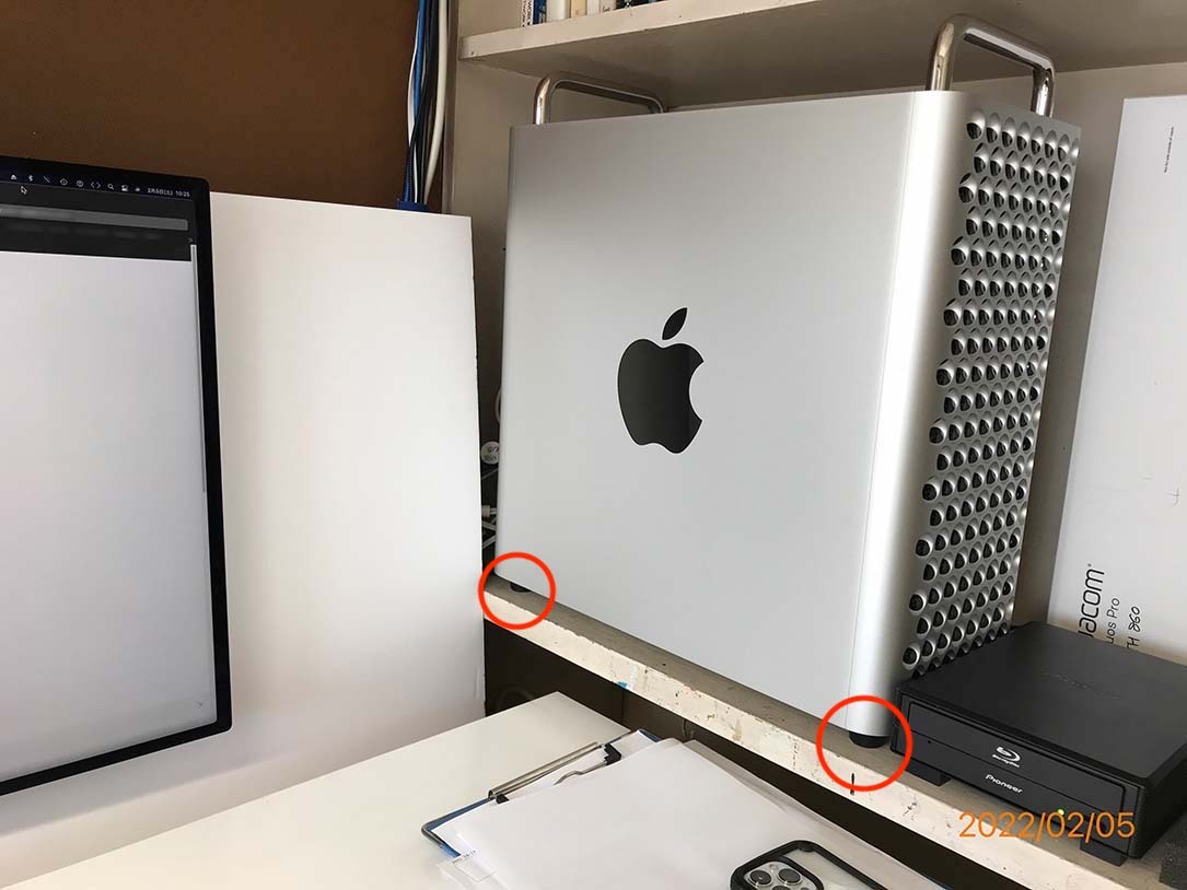 どうしても横の本棚に収納したいので、MacPro 2019のスタンド(足)を取り外し代わりにゴム足を取り付けました。