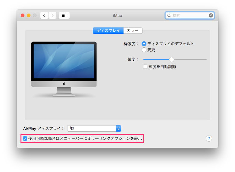 「システム環境設定→ディスプレイ」で、「使用可能な場合はメニューバーにミラーリングオプションを表示」が出てくると思われるのですが、表示がありません。