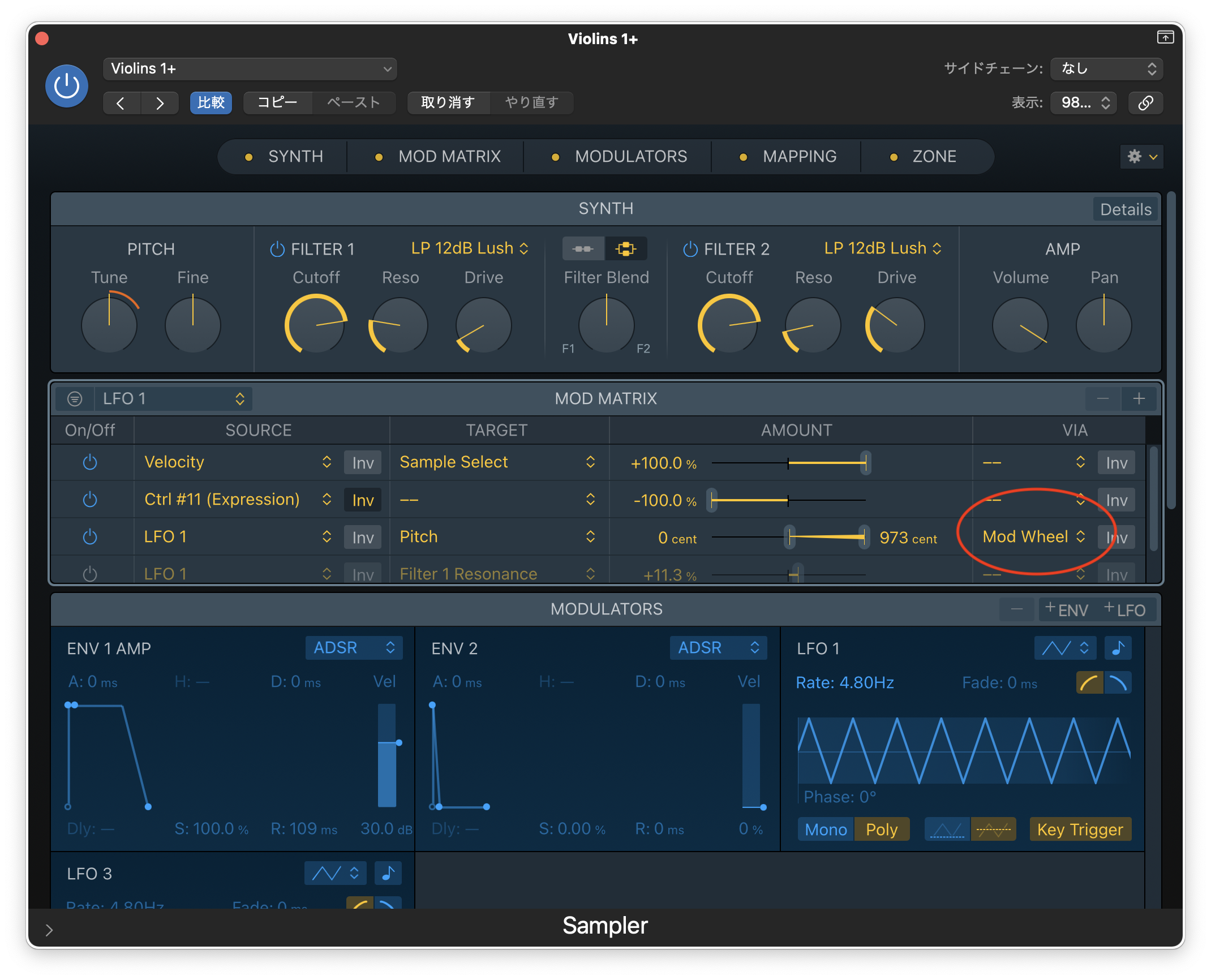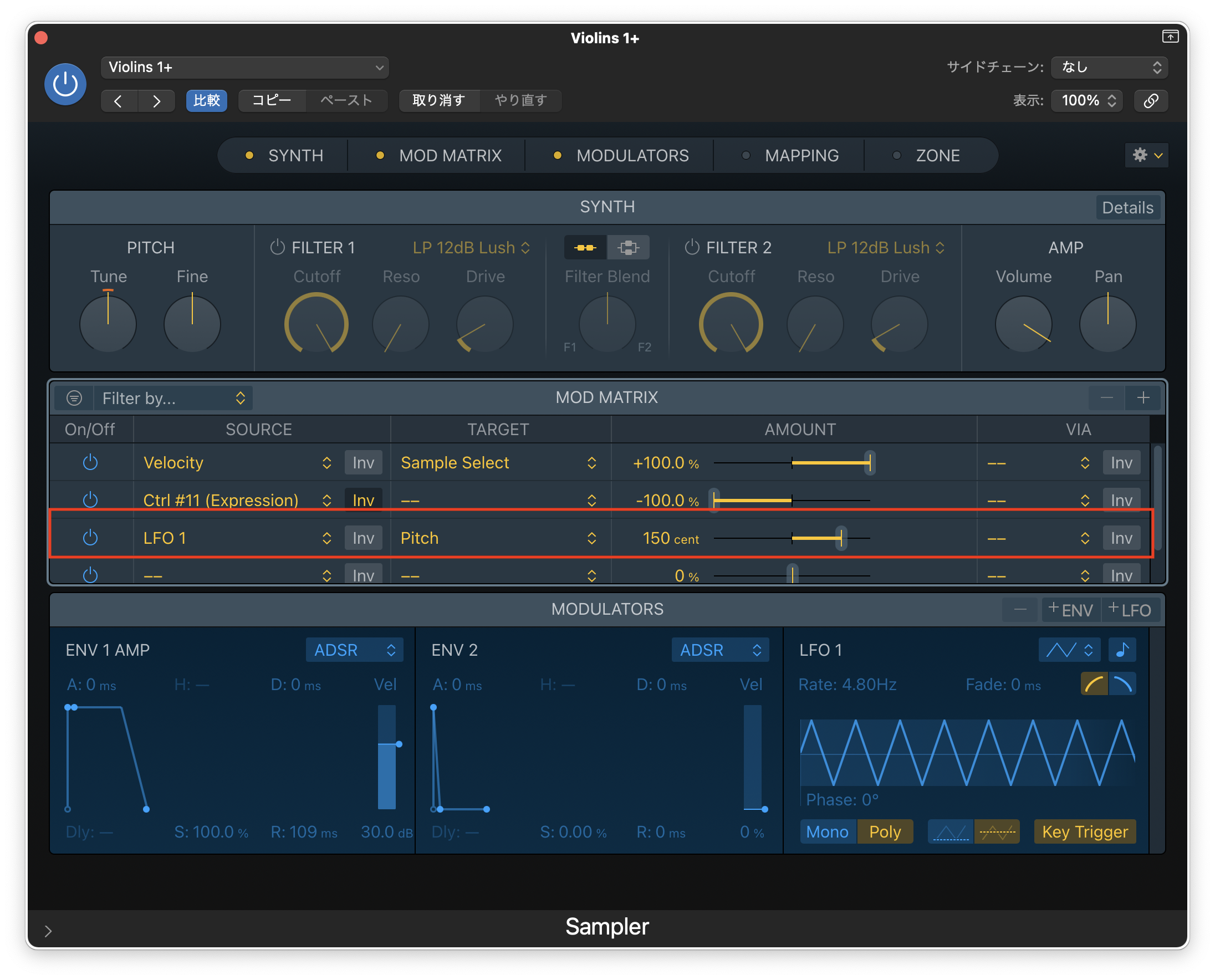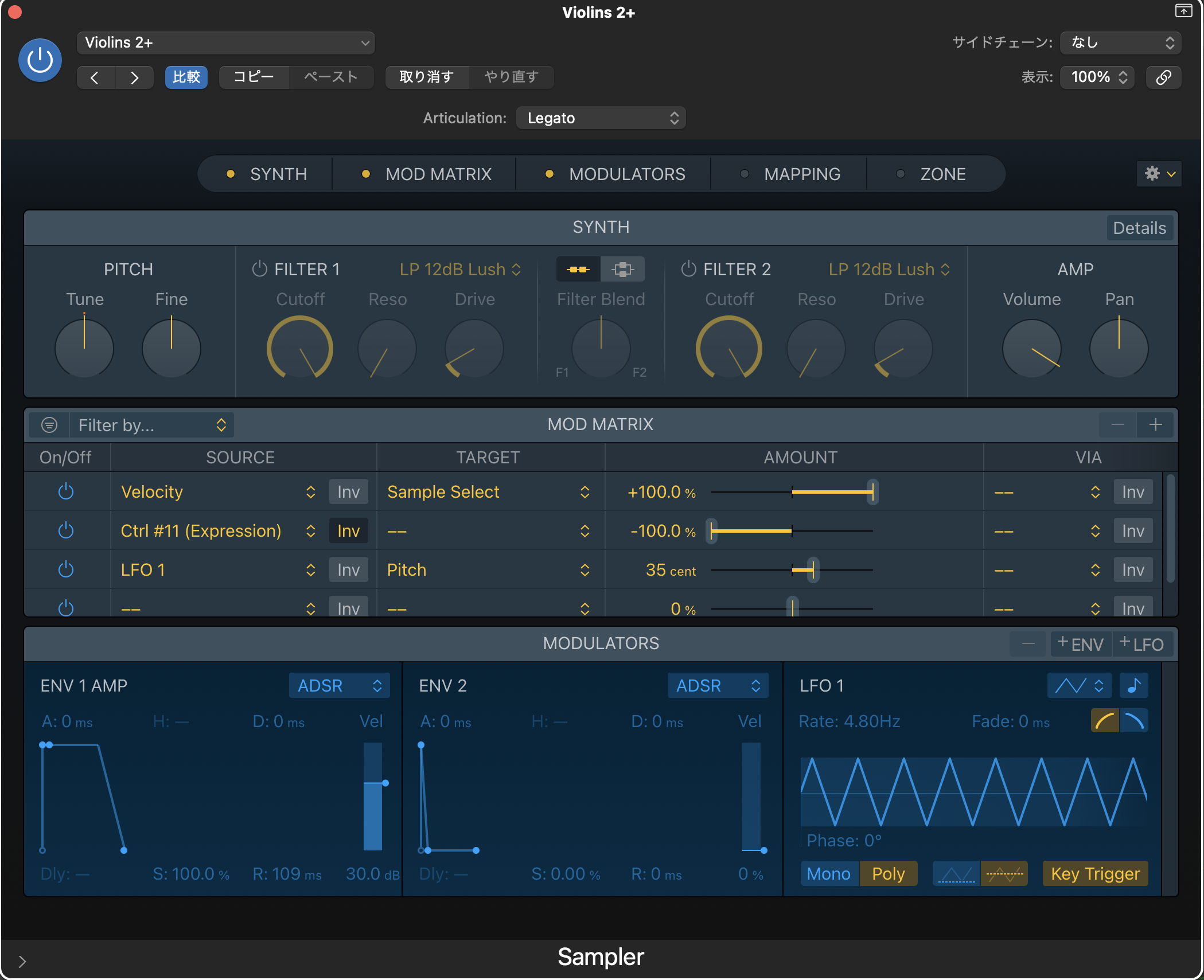 logicでストリングスを打ち込んだ際のビブラートの掛け方について