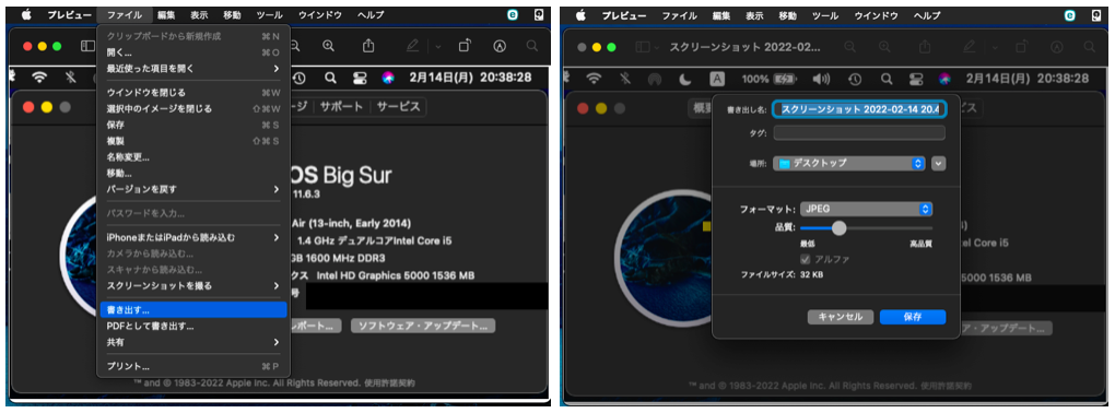 「ファイル」を選び、プルダウンメニューを出して「書き出す」を選ぶと、右の画像のように表示されますので、フォーマットを「JPEG」あたりを選んで品質を最低方向を選べばサイズ小さくなります。