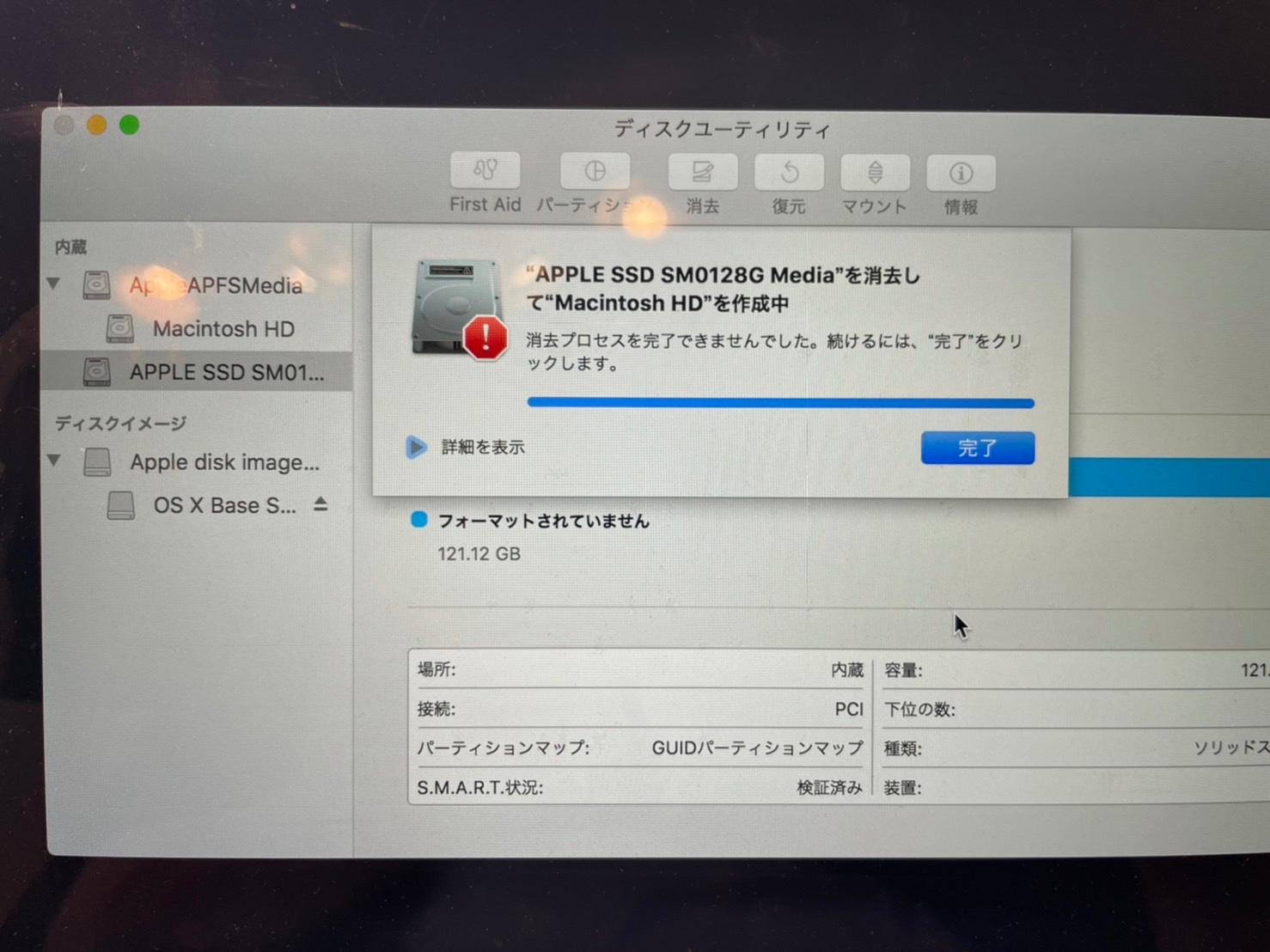 最初のスクリーンショットではAppleAPFSMediaを選択した状態で情報のところにはdisk2となってます。2番目のAPPLE SSD ...の消去に失敗したと言うショットでは肝心の点が写ってないのでわかりませんが、diskの数字は幾つになってるのでしょう?本来の内蔵ディスクそのものであればdisk0になってるはずなんですが。