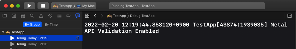 Xcodeを起動してすぐにRunを実行(▶マークのボタン押下)した直後のものです.Debug Today x:xx 部分には何も表示されていませんでした.