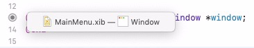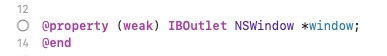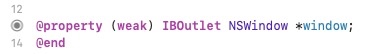 プロジェクトを開いた直後にリストから「AppDelegate.m」を選択するとそのソースコードが表示されると思いますが、プロパティの IBOutlet の部分が白丸〇となっています.この状態で白丸〇をoptionクリックしても吹き出しが出ません.