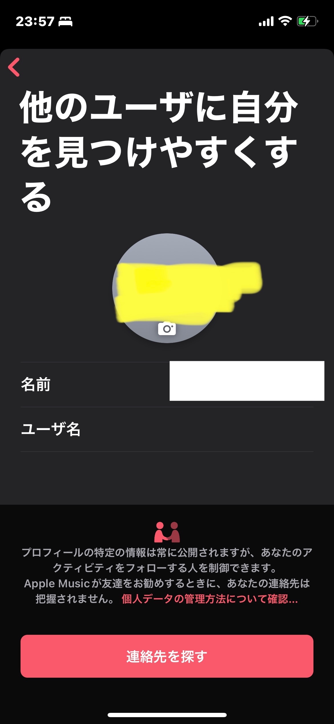 アップルミュージックの「連絡先を探す」が反応しない。ユーザー名も入力出来ない。
