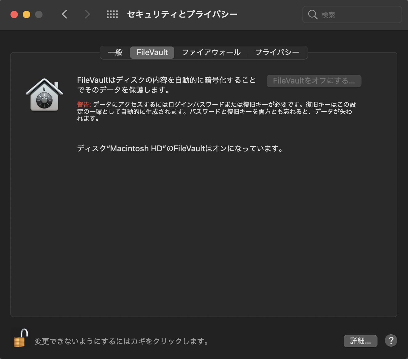 FileVaultをオフにする ボタンが押せずTime Machineでバックアップが行われない