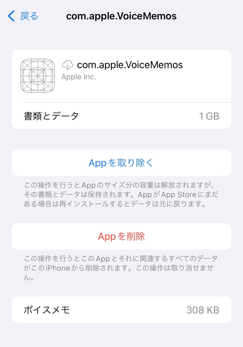 ボイスメモ データ消去したがストレージ容量改善しません