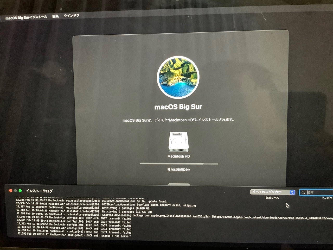 ディスク消去後、command+RでmacOS 復旧を起動し、macOS Big Surの再インストールを実行しましたが、さっぱり進行しません。
