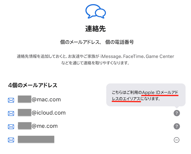 添付画像(「Apple ID管理サイト」>「個人情報」>「連絡先」)の例で言えば、