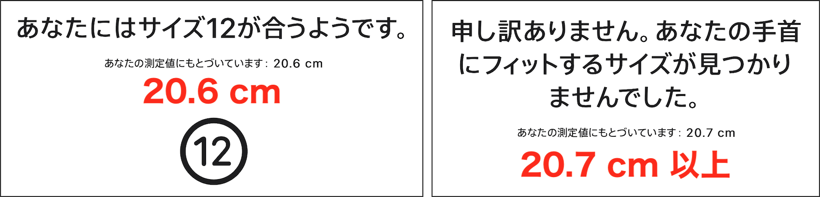ソロループやブレイデッドソロループの場合は、確かに手首周りが 21 cm の場合は、下の画像右側の様なメッセージが表示されますが、20.6 cm までであれば、下の画像右側の様にサイズ 12 が適合 します。