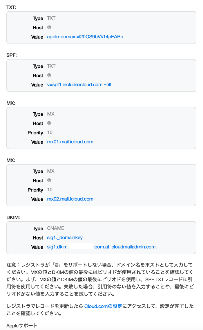 メール通知の注記に「まず、MXとDKIMの値の末尾にピリオドを含め、SPF TXTレコードに引用符を追加してください。問題が発生した場合は、引用符または末尾の句読点を除いた値を入力してみてください。」とありましたが、これはサポートでもわからなかった内容で困っています。解決方法をご存知の方が居られましたらご教授いただけますと助かります。(サポートでは最新OSのiPhoneでやってみてほしいと言われ、やってみましたが結果は同じでした)