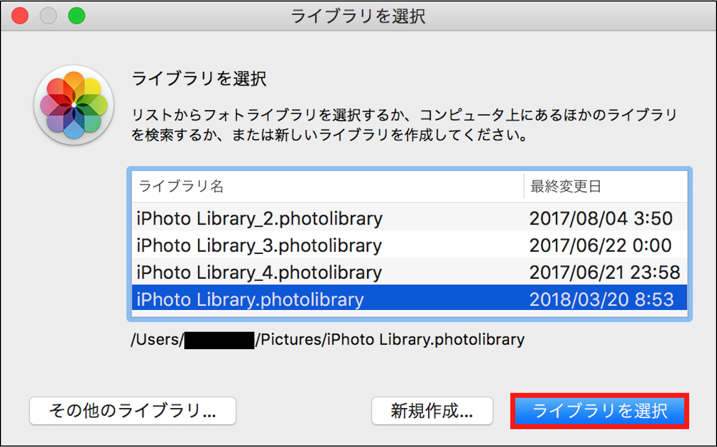 まず、「Time Machine」等でバックアップを取ってから、「option」キーを押しながら「写真.app」を起動 すると表示される、「ライブラリを選択」ウインドウで、下の画像の様に 「写真.app」に移行したい「iPhoto ライブラリ」を選択し、「ライブラリを選択」ボタンをクリック して下さい。