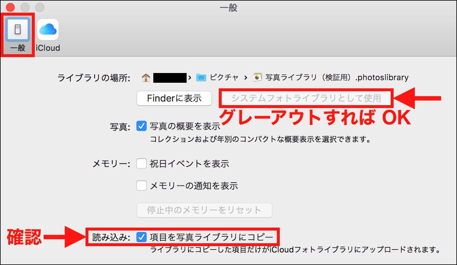 次に、「写真」メニュー >「環境設定」>「一般」タブで、下の画像の様に 「システムフォトライブラリとして使用」ボタンをクリックして、「システムフォトライブラリとして使用」ボタンがグレーアウトしている事と、「読み込み」の「項目を写真ライブラリにコピー」の項目にチェックが入っている事を確認 して下さい。