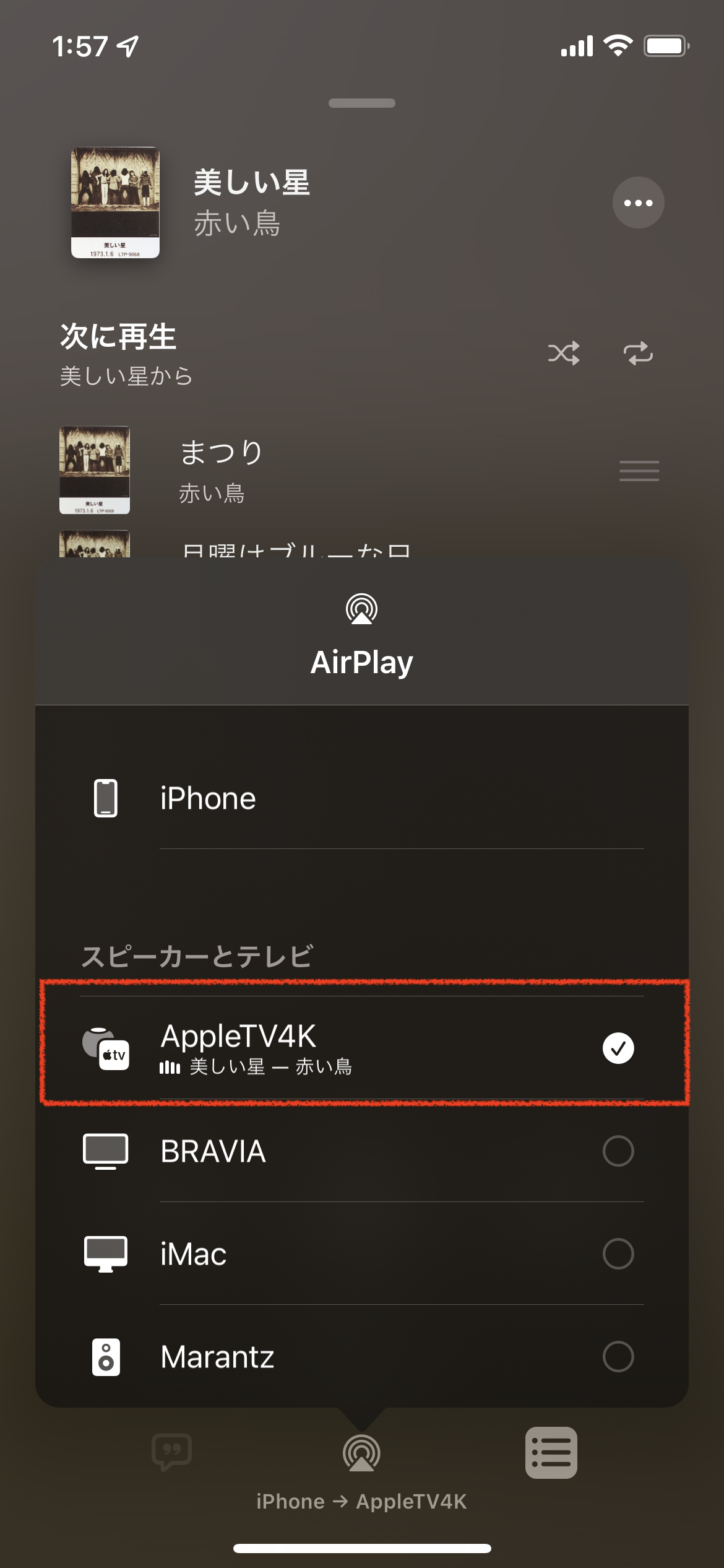 ミュージックアプリからこのデバイスを出力先にした時は、Apple TV 4K本体の電源は入らず、HomePod miniから音声のみが再生されます。