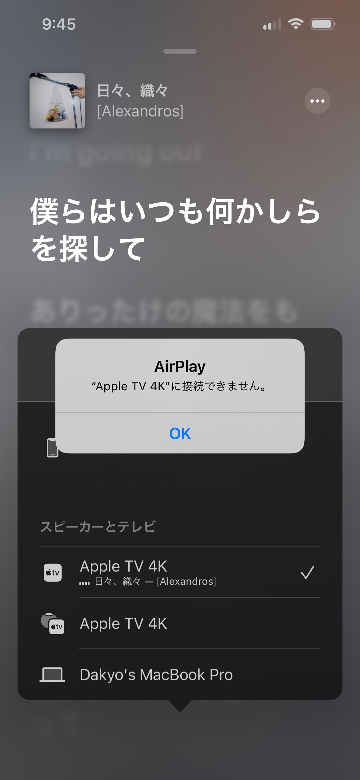 また、iPhone→Homepod miniやMacbook Pro→Apple TV 4Kなど、他の機器の組み合わせでのAirplayの使用は全く問題ないのですが、何故か上記での場合のみ上手く作動していないようです。