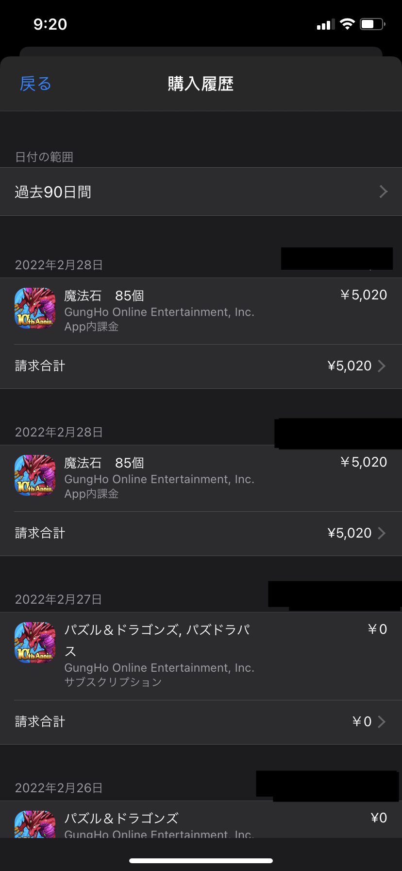 また、3枚目のスクリーンショットに、2022 年 2 月 28 日購入の App 内課金「魔法石 85 個(5,020 円)」が2件表示されていますが、これは今回の購入と関係が有るのでしょうか?