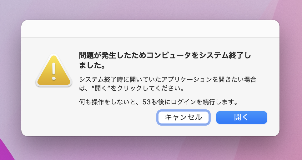 下記のダイアログがスリープ解除後、毎回再起動されて出ていましたが、「AdGuard for Safari」という広告ブロックとプライバシー保護をアンインストールしたところ、全く出なくなりました。