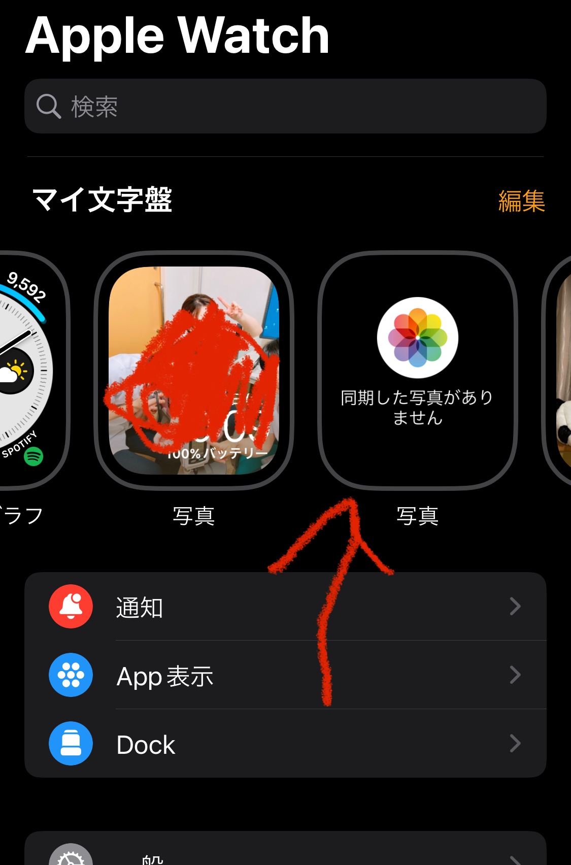 「写真」の文字盤で「同期した写真がありません」と表示され写真が表示されないということですね。