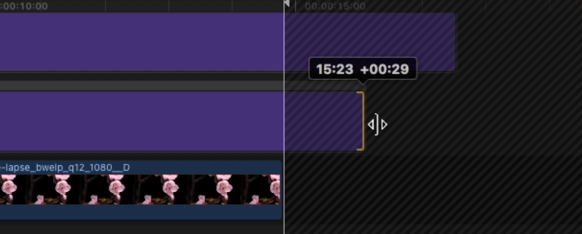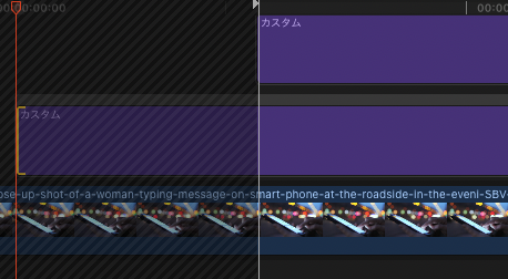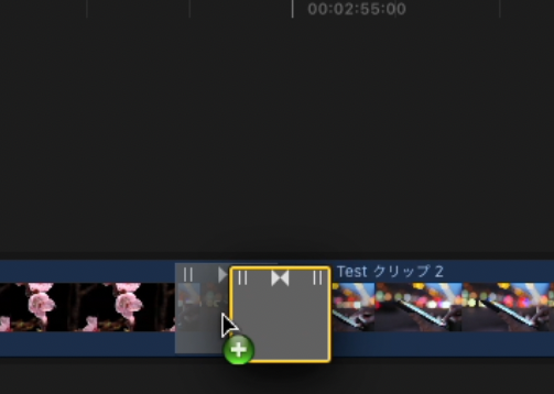 ※静止画やタイトルでは問題ありませんが、動画でトランジション部分にのりしろが無い(=クリップの後ろ、または前をいっぱいいっぱい使っている)と、そのぶん尺が縮む可能性があります。
