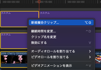 2) 1)の状態のままで右クリックして「新規複合クリップ」を選んでください。