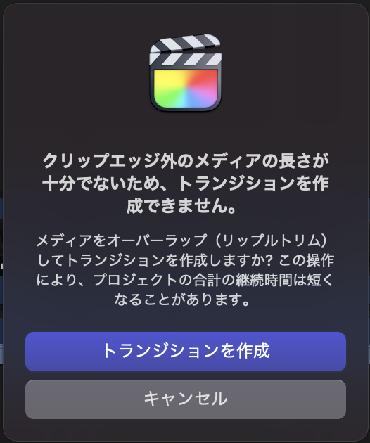 そのままドラッグすると下記のようなメッセージが表示され、そのままトランジションを作成すると前にあるクリップ(まっくまっくさんの説明のAのクリップ)が少しだけ短くなり、トランジションが作成されます。