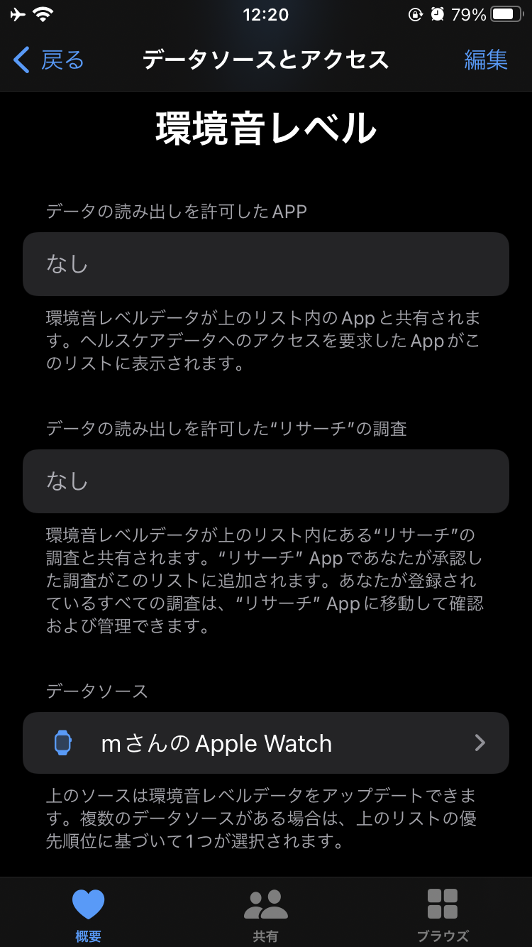 apple watchとiphoneの環境音測定はオフになっています。環境音レベルのデータソースがapple watchになっているため、apple watch からのデータをiphoneが受信し解析していると思われます。apple watchの環境音測定がオフ表示になっているのに関わらず、データを送信している疑いがあります。