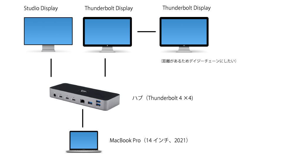 MacBookProからStudio Displayにケーブル1本で接続し、電源供給とThunderbolt Display 2台の接続も行いたかった。