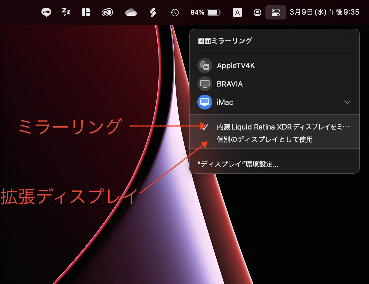 ミラーリングか拡張ディスプレイかの設定はここでもできます。