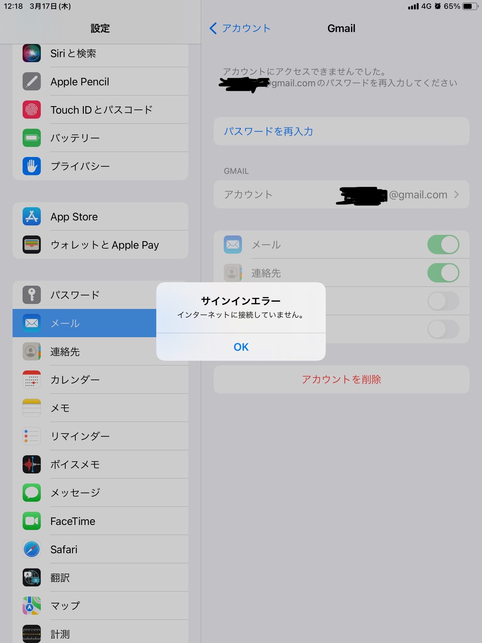 設定→メール→アカウント→Gmail→パスワードを再入力→サインエラー インターネットに接続していません